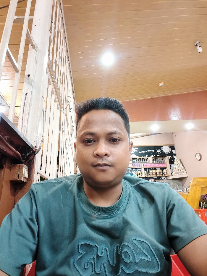 A medium close-up portrait depicts an adult male, appearing in his 20s or 30s, of Southeast Asian descent, looking directly at the camera with a neutral expression. He has short, dark hair and is wearing a dark teal crew-neck t-shirt with embossed lettering on the front. He is seated, with a red surface, likely a chair, visible beneath him. The scene is an indoor establishment, identified as a cafe or coffee shop in Lhokseumawe, Indonesia. The background on the left features a white vertical slatted partition or railing, and a dark brown wooden beam with an attached electrical fixture. The background on the right reveals a wall with a light brown upper section and a reddish-brown band below. A wall mural or sign displays partially reversed text, including "fresh coffee," along with coffee-related graphics. Below this, shelves are stocked with numerous small packages and stacked white cups. A small, light-faced clock is mounted on the wall. A wooden structure, possibly part of furniture or a counter, is visible on the far right. The ceiling is paneled in a light brown hue, featuring several bright recessed lights and a white, dome-shaped security camera mounted in the upper right. The environment is well-lit by artificial sources.