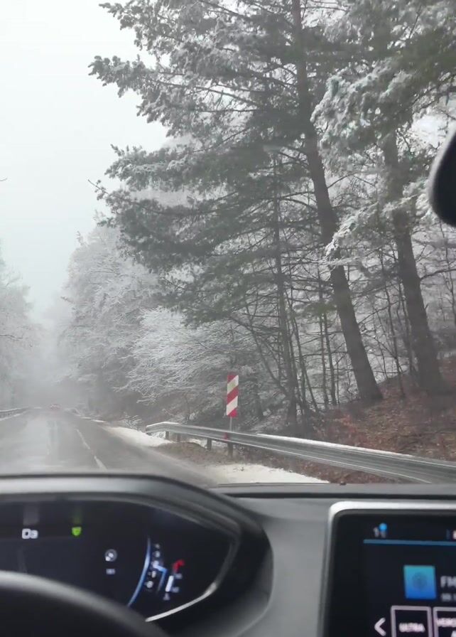 driver's perspective while driving on a snow-covered road through a forest. The trees on either side of the road are heavily covered in snow, and fog or mist is present, reducing visibility. The road appears to be paved and mostly clear, with some snow accumulation on the shoulders. Red taillights of a vehicle ahead are visible. The dashboard of the car is visible, showing the speedometer, other gauges, and a media screen displaying radio information. The steering wheel and part of the car's interior are also visible. The overall scene conveys a cold, wintery, and somewhat isolated environment.