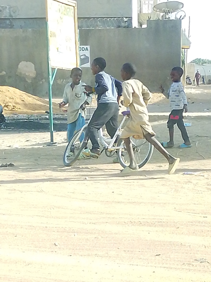 Four young boys are on a dirt road near a building with a sign. One boy is on a white bicycle, while the other three stand nearby. The boy on the bicycle is wearing gray pants and a blue shirt. One of the other boys is wearing a light shirt and blue jeans, while the other two boys are wearing long-sleeved shirts. One boy is walking with a pair of sandals. Several other people are visible in the background.