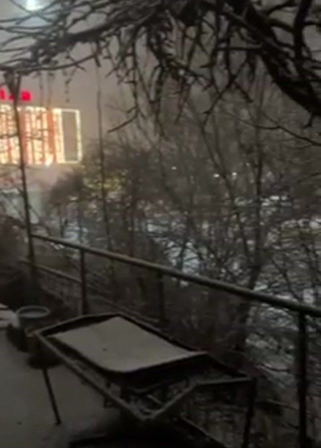 snowy scene outside what appears to be a balcony or porch. Snow is falling steadily. The foreground shows a metal railing covered in snow, along with an overturned metal frame object that is also covered in snow. In the background, bare trees are visible, also dusted with snow. Further in the background, lights and a sign are partially visible, possibly indicating a building or structure. The sign is mostly obscured but appears to have some red lettering. The overall atmosphere is cold and quiet, typical of a winter scene.