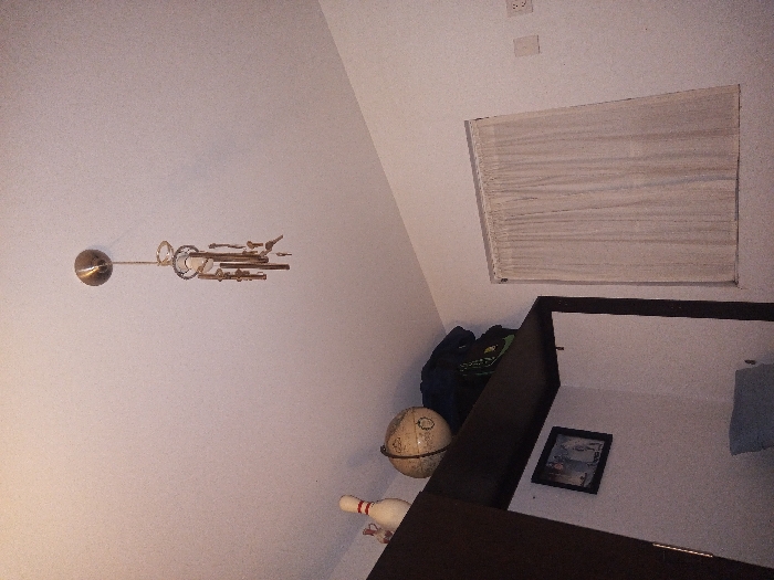 A room contains a bed frame made of dark wood, positioned near a wall with a window covered by white blinds. A globe and a blue backpack rest beside the bed frame. A bowling pin is near the globe. On the adjacent wall, a wind chime hangs. Electrical outlets are above the window.