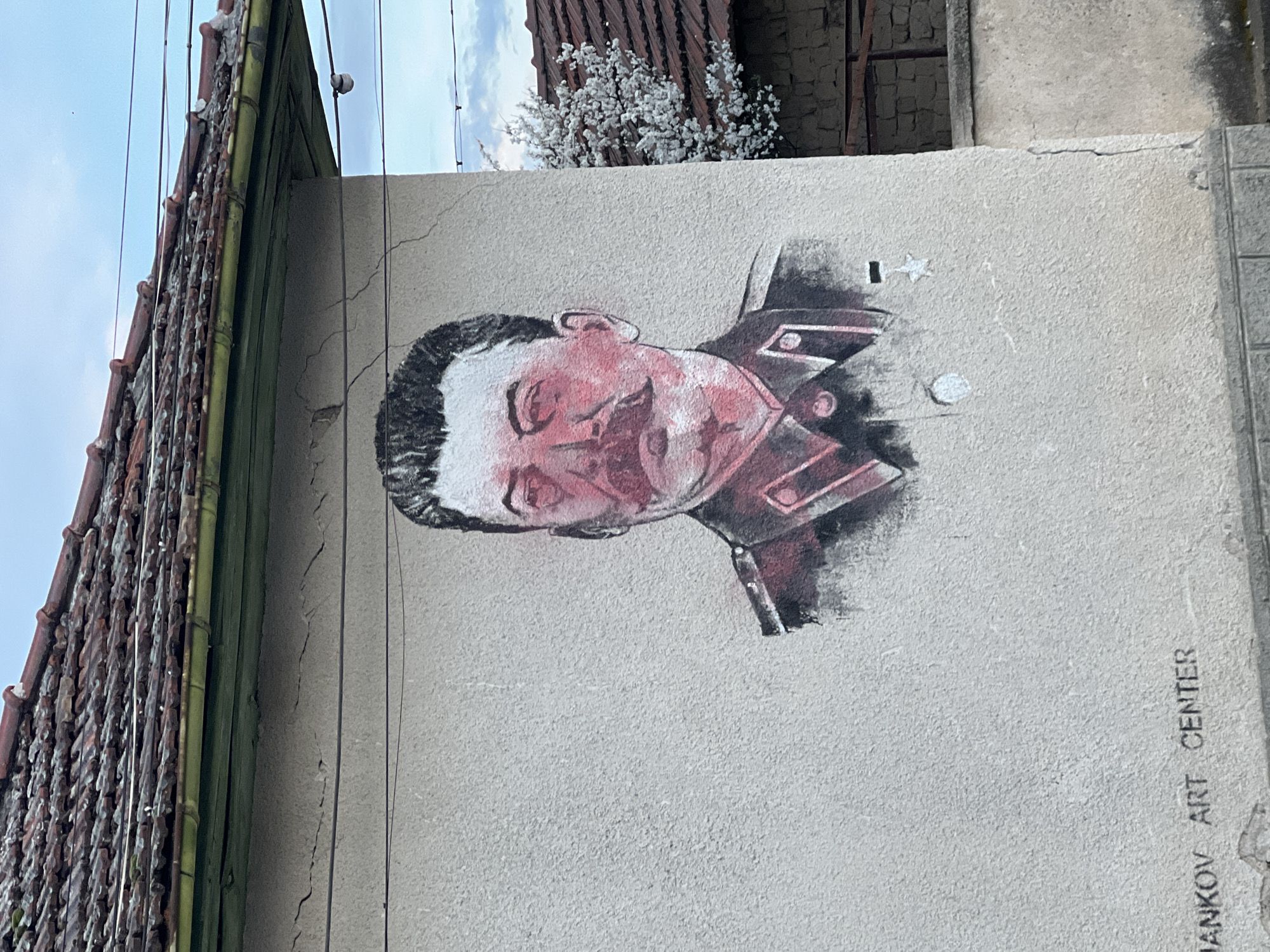 mural on the exterior wall of a building in Novo Zhelezare, Bulgaria. The mural depicts a stylized portrait of a man in what appears to be a military uniform. The artwork is predominantly in shades of red, black, and white. The wall itself is textured and light gray, with visible cracks. Part of the building's roof with terracotta tiles and green gutter is visible on the left side of the frame. Some power lines stretch horizontally across the upper part of the image. A tree with white blossoms can be seen above the building. The words "DANKOV ART CENTER" are faintly visible on the bottom right corner of the mural.