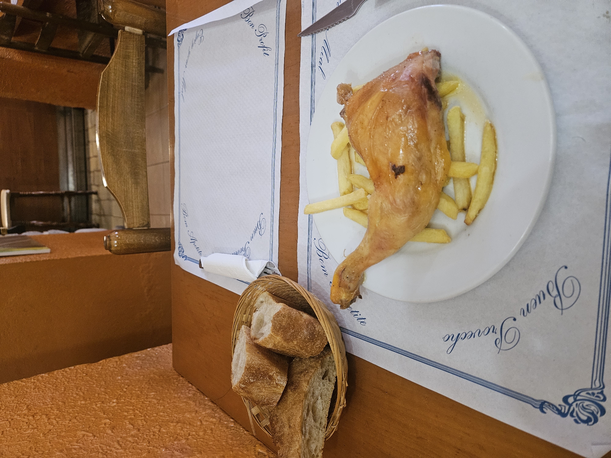 The image depicts a dining table set for one person in a restaurant located in Mas Aliu, Spain. A white ceramic plate centrally features a roasted chicken quarter (comprising a drumstick and thigh) accompanied by a serving of golden-brown French fries, with some visible grease on the plate. To the left, a small, light-brown woven basket contains several pieces of sliced baguette. A serrated knife rests on the white paper placemat to the right of the plate. The placemat features blue decorative borders and the phrase "Buen Provecho" (Spanish for "enjoy your meal") printed in blue script. The table surface is a light-brown wood. In the background, a heavily textured, dark orange wall is visible on the left, while a wooden chair back is present on the right, indicating an unoccupied seating area. A narrow, dark-brown bottle or jar is partially visible behind the placemat on the right side. The overall lighting suggests an indoor setting. No individuals or active interactions are visible in the scene.