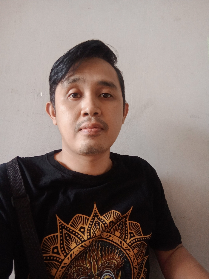 A man poses for a selfie. He is wearing a black t-shirt with a gold mandala-style design. A dark strap is slung over his shoulder. He has short, dark hair styled with a slight wave and a thin mustache. His skin is light-medium tone, and he looks directly at the camera with a neutral expression. The background is a plain, light-colored wall.