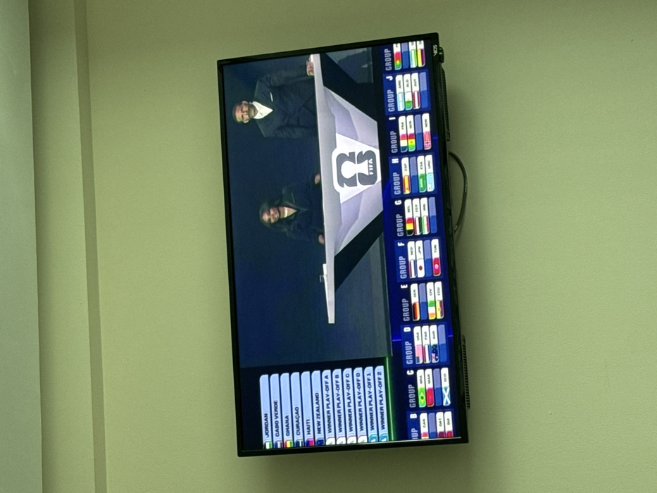 TV screen mounted on a light green wall. The screen displays the FIFA World Cup Draw. Two people are on screen behind a table with the FIFA logo. The draw information shows team names like Jordan, Cabo Verde, Ghana, and Curacao, plus “Winner Play-Off” qualifiers. Groups B through J are displayed with country flags and group names. The Vios brand is visible on the top right corner of the television.