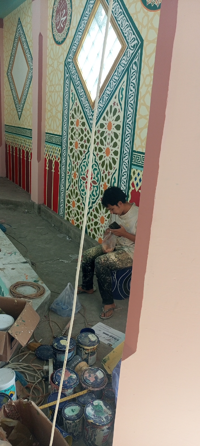 A man sits amidst paint cans and construction debris, focused on his mobile phone while holding a plastic bag. He wears paint-splattered pants and a light-colored shirt. Elaborate Islamic art adorns the walls in the background, featuring geometric patterns, calligraphy, and decorative borders, accentuated by diamond-shaped window frames. The walls are painted with a mix of beige, teal, orange, and red hues. A pink pillar is partially visible.