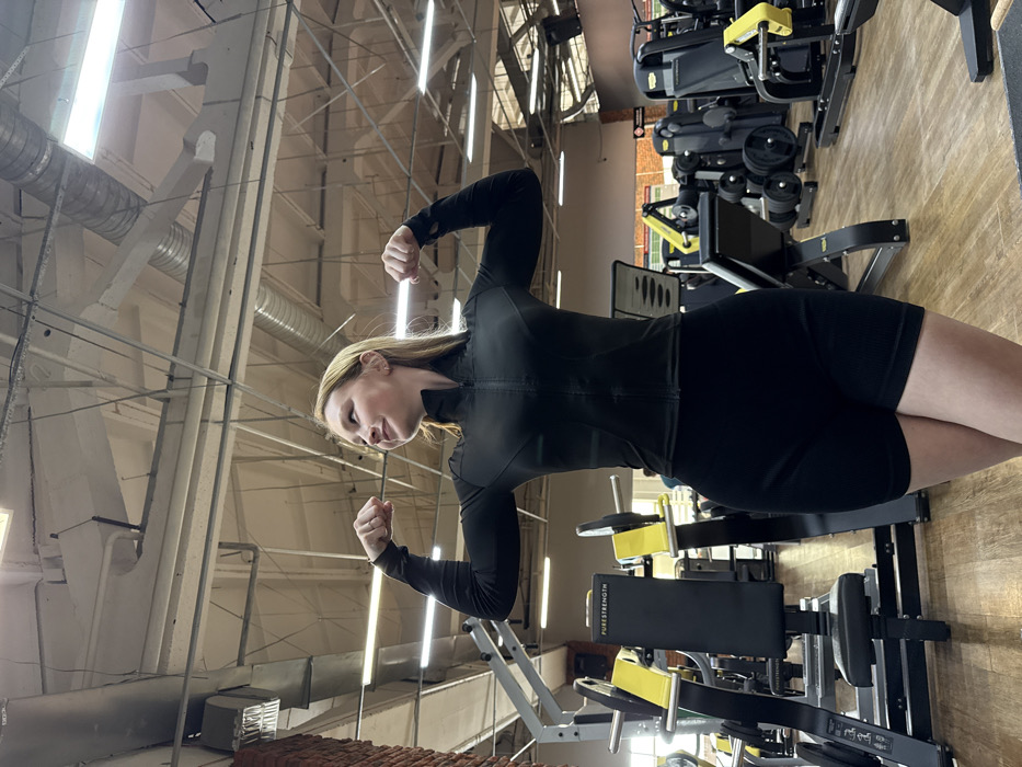 A young adult female with light-colored hair is depicted standing in a gym in Chaikovsky, Russia