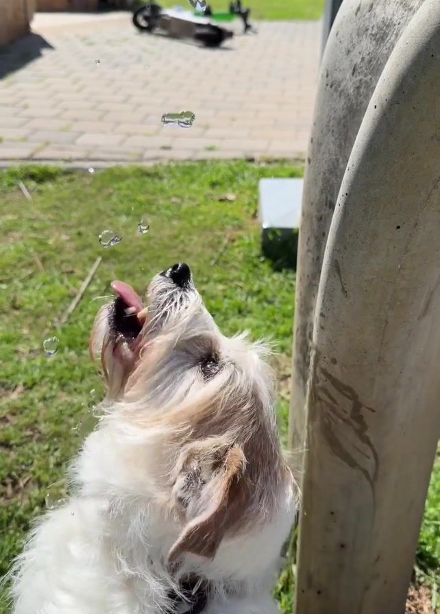 A small, long-haired dog with white and brown fur looks up towards a dripping water source, possibly a pipe or fountain feature