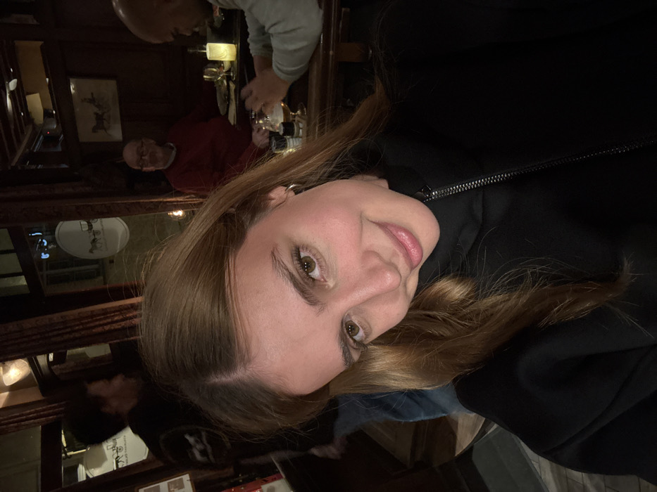 This image depicts the interior of Restaurant Koetshuis in Bruges, Belgium, at night. The scene is dimly lit, characterized by dark wooden paneling on walls and ceilings, creating a traditional, cozy ambiance. In the foreground, a young adult female, estimated to be between 20-30 years old, with light brown, shoulder-length hair parted centrally, is positioned, looking directly at the camera with a slight, closed-lip smile. She is wearing a black zippered jacket or sweatshirt. A small, silver-colored hoop earring is visible on her left ear. In the midground and background, other individuals are present. To the left, a male with dark hair, wearing a dark top, is partially visible and appears to be moving away from the camera. In the right midground, an older male with glasses and a red long-sleeved top is seated at a dark wooden table, looking generally forward. To his right, a bald male in a light grey long-sleeved top is also seated at a table, his hands positioned near a glass of beer, salt and pepper shakers, and a small, illuminated white rectangular object. The environment includes several details: * A window in the upper left quadrant reflects an oval sign with a white horse-drawn carriage logo and text, indicative of the "Restaurant Koetshuis" establishment. * A framed picture depicting a horse-drawn scene hangs on the wooden wall above the man in the red sweater. * Tables are dark wood, set with various drinking glasses and condiments. * Lighting is primarily provided by localized warm lights, including a small lamp on the table.