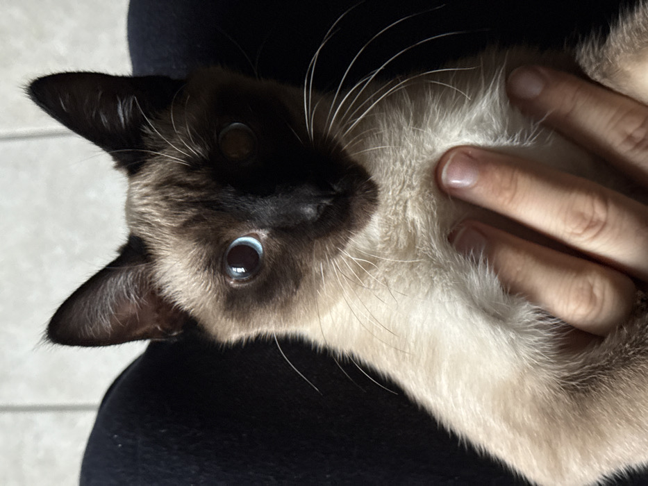 - "A close-up, high-angle portrait shot depicts a Siamese-type cat being held by a person indoors" by FM-euyLP2, licensed under CC BY 4.0