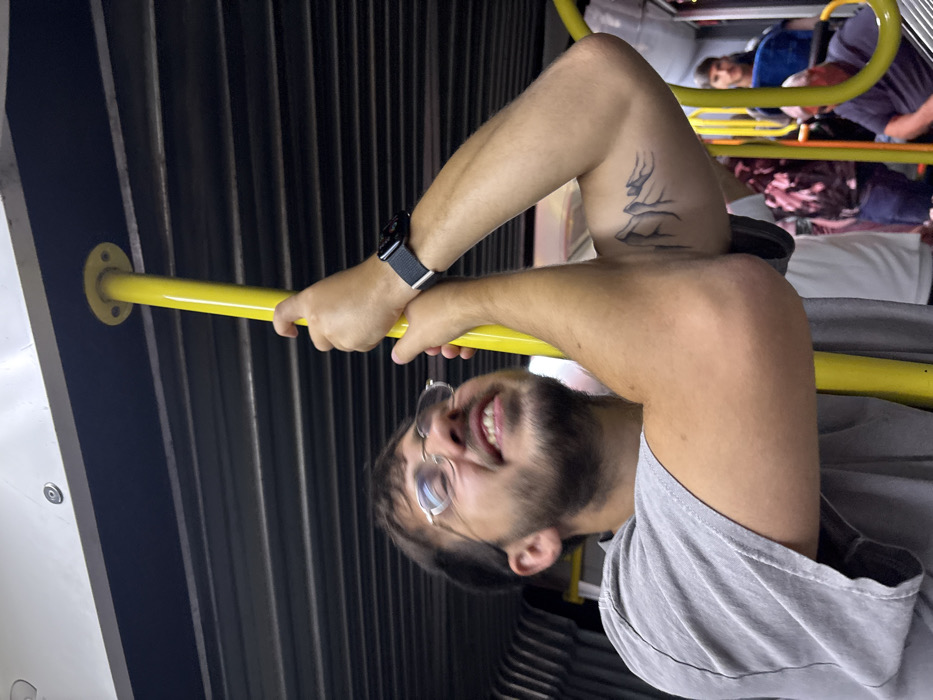 A young adult male, with a beard and eyeglasses, wears a grey t-shirt and holds a bright yellow vertical pole with both hands. He exhibits a broad smile with visible upper teeth, and his eyes appear closed or squinting as he looks upwards and to his right. A black smartwatch is present on his left wrist, and a black mountain range tattoo is visible on his upper left arm. The immediate environment is the interior of a public transport vehicle, characterized by dark, horizontally ribbed panels on the walls/ceiling and lighter panels above. In the background, other passengers are partially visible, including a male figure in a dark shirt looking towards the camera, and additional yellow poles and blue seating elements. This scene is set within a public transport vehicle at Ben-Gurion Airport, Israel.