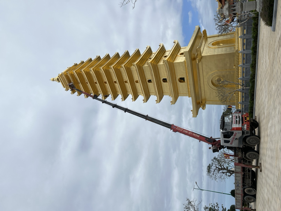 A tall, golden pagoda with multiple levels stands prominently against a cloudy sky. A large crane truck is parked nearby, its boom extended towards the pagoda's top. The truck is red and white with visible signage. The pagoda is surrounded by a paved area, a low fence, and some sparse vegetation. The scene suggests ongoing construction or maintenance work at the temple site.