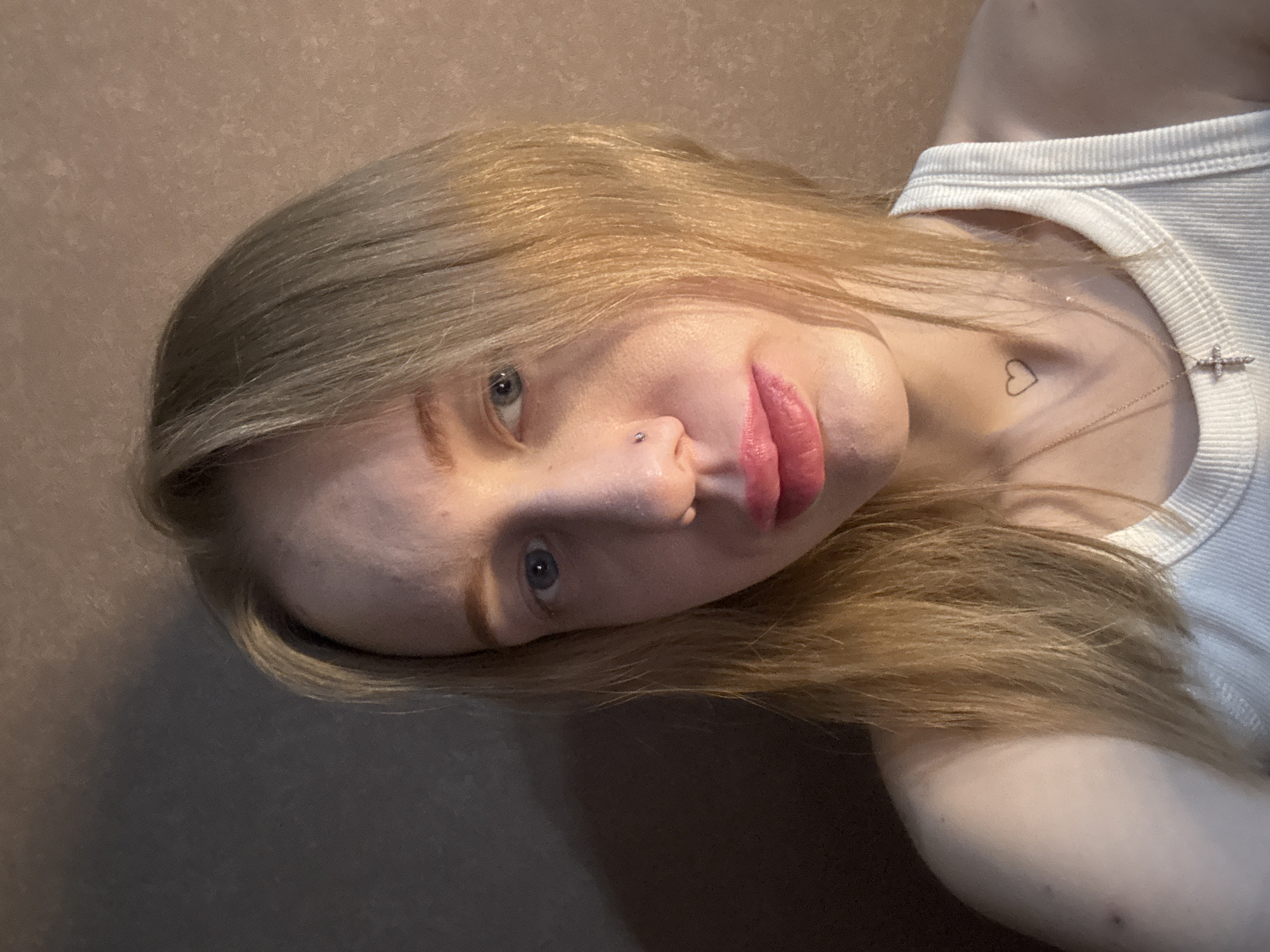 A close-up portrait shows an individual with fair skin, light blonde hair, and blue eyes, looking directly at the viewer. The person has a small, metallic stud piercing on the left nostril and wears pink-toned lip color. A small, outline heart tattoo is visible on the left side of the neck, and a delicate chain necklace with a cross pendant adorns the collarbone area. The individual is wearing a white ribbed tank top. The background is a plain, textured wall, transitioning from a lighter brown hue on the right to a darker, shadowed tone on the left. The scene is located in Rostov-on-Don, Russia.