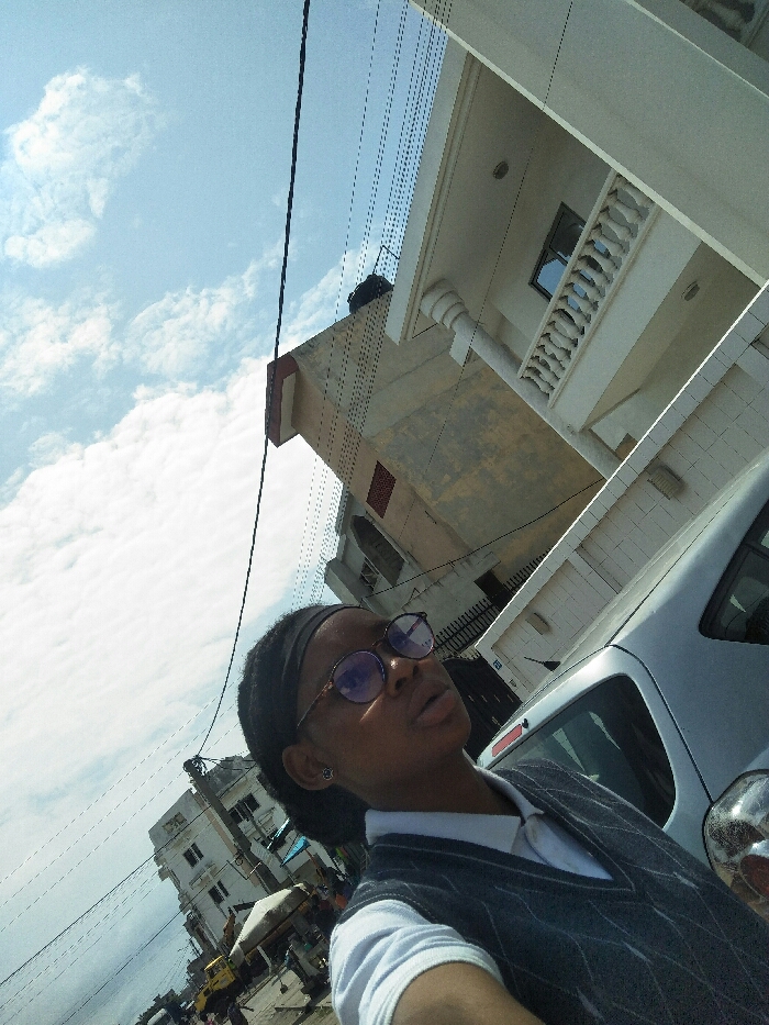 The image displays a street scene in Cotonou, Benin, captured from a low-angle perspective, tilted slightly. In the immediate foreground, a young woman of African descent is visible from the chest up, engaged in taking a selfie. She wears a dark headband, circular glasses with purple-tinted lenses, a white collared shirt, and a dark grey V-neck sweater vest with a lighter patterned design. A silver stud earring is present in her left ear. Her gaze is directed slightly upwards and to the right, with her lips parted. Behind her, to the right, a silver or light grey passenger vehicle, possibly a hatchback, is partially visible, appearing to be parked. Directly behind the vehicle and extending upwards on the right side of the frame is a multi-story building with a light-colored, possibly stucco, facade. This building features a balcony with white balustrades and a prominent round column. Further into the background and slightly to the left, another building with a discolored, aged facade is visible, topped by a dark water tank. The left side of the image reveals a street extending into the distance, lined with several other multi-story buildings of varying designs. A utility pole is present among these structures. Fine black electrical or communication wires crisscross the sky, running both vertically and diagonally across the frame. The sky occupies a significant portion of the upper frame, displaying a bright blue hue with scattered white cumulus clouds. The scene is brightly lit, indicating daytime conditions.