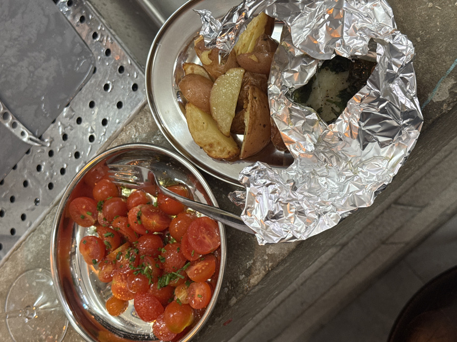 Two metal plates containing food are positioned on a dark, textured surface, likely a countertop, with a metallic, perforated surface in the upper background. The left plate, a shallow, round, silver-colored dish, holds numerous red cherry tomatoes, many whole, some halved, coated in oil and garnished with chopped green herbs. A silver four-tined fork is partially submerged within the tomatoes, its handle oriented towards the right. The right plate, also a shallow, round, silver-colored dish, contains roasted potato wedges, varying in color from light brown to yellow, with some skin visible. A piece of crumpled aluminum foil occupies the front portion of this plate, partially obscuring the potatoes. Within the exposed section of the foil, a white food item, possibly fish or cheese, is visible, interspersed with green specks, indicating a dish cooked or served within the foil. The dark surface beneath the plates appears to be a worn concrete or stone material. The metallic surface in the upper right background features a grid of circular perforations. A faint, slender reflection, consistent with the stem of a wine glass, is visible in the upper left background. No individuals are depicted. The specific location within the city of Tel-Aviv, Israel, is not discernible from the provided image content.