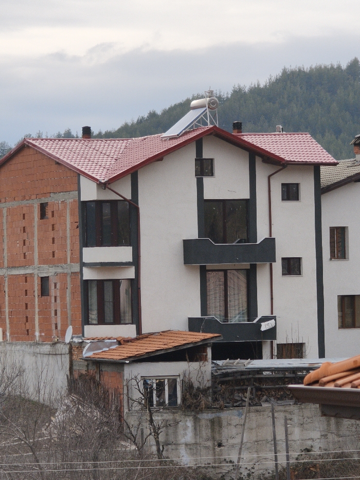 This image depicts a residential scene in the city of Ribnovo, Bulgaria, characterized by multiple buildings under an overcast sky. The central focus is a multi-story house with a white facade and dark gray trim, featuring a red tiled roof topped with a functional solar water heating system consisting of a horizontal cylindrical tank and a tilted solar panel array. This house exhibits multiple dark-framed windows of varying sizes and two prominent, dark gray rectangular balconies, one positioned above the other, with the lower balcony showing a broken or unfinished railing. To the immediate left, an unfinished brick structure is visible, exposing red bricks and partial framing, also topped with a matching red tiled roof. A small white satellite dish is attached to a lower section of the wall between these two buildings. Further to the right, a portion of another white house with dark trim and brown-framed windows is partially visible, featuring a greenish-gray tiled roof. In the foreground, below the main structures, there is a smaller, light gray building with a steeply pitched orange tiled roof and a single window, positioned in front of a concrete retaining wall. Adjacent to this small building, piles of wood and miscellaneous debris are visible behind a lower concrete wall. Bare tree branches, indicative of a dormant season, extend into the lower foreground, with faint horizontal lines, possibly wires, crossing the very bottom of the frame. The background is dominated by a dense, dark green coniferous forest covering a gentle slope under a hazy, cloudy sky. No individuals or specific actions are observable within the frame.