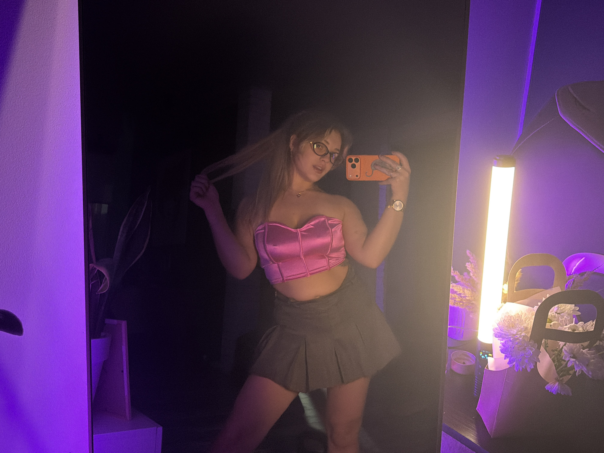A young woman is taking a selfie in a mirror. She has brown hair and wears glasses, a pink corset top, and a grey pleated skirt. She holds an orange phone in her right hand and tugs at her hair with her left. The background is dark, with purple lighting illuminating the walls and objects around the mirror. A tall, thin light source stands near a decorative display featuring flowers in paper bags and other decorative items. A houseplant is visible on a shelf to the left. There is no evidence to support this image being in the city of Большая Шильна, Russia.