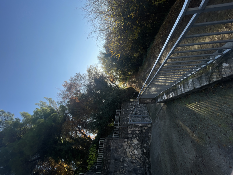 The image depicts an outdoor scene in Budva, Montenegro, characterized by natural elements and constructed features under a clear, bright blue sky. No individuals or active interactions are present. The foreground on the left features a dark grey, asphalt or concrete surface, likely a driveway or access path. This surface receives sharp, parallel shadows cast by a metal railing, indicating a low sun angle from the right. To the immediate right of this paved area, a low, mortared stone border supports a grey metal railing consisting of vertical bars with two horizontal top rails. Further left, a substantial retaining wall constructed from irregularly shaped, multi-colored stones (grey, brown, tan) rises upwards. A section of grey metal fencing with horizontal bars is visible atop this wall, securing the upper slope. A closed, grey metal gate is set into the lower portion of the stone retaining wall. The left side of the scene is dominated by dense vegetation, including tall evergreen trees, likely pines, extending towards the top of the frame, and various deciduous and evergreen bushes. The upper portions of some trees exhibit autumnal foliage with yellow and brown leaves. On the right side of the image, a dirt or gravel path slopes gently upwards and curves into the distance, disappearing behind more dense foliage. This path is bordered by thick vegetation, predominantly trees and bushes displaying a mix of green and autumnal yellow-brown leaves. Sunlight illuminates parts of this path and the foliage, creating bright highlights. The overall environment suggests a semi-natural or landscaped area, possibly a hillside or parkland adjacent to residential property.