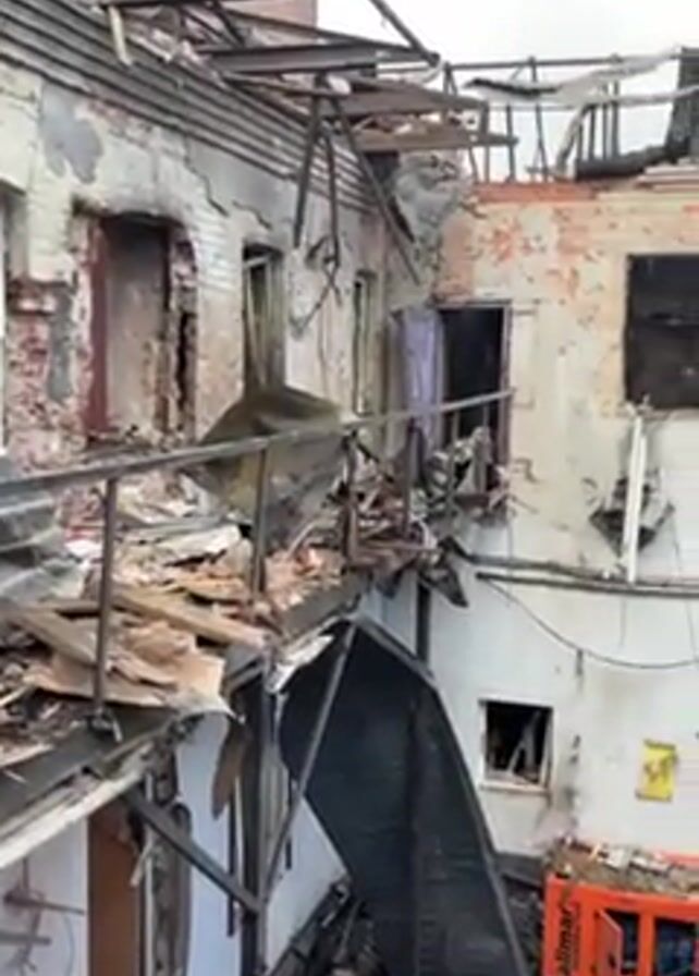 interior of a heavily damaged building. Much of the roof has collapsed, leaving exposed metal beams and debris. Walls are crumbling, revealing brickwork. Windows are broken and missing. An orange generator is visible on the ground level. A person in a dark uniform and cap stands near the generator. The sky is visible above, suggesting a partially open-air environment.