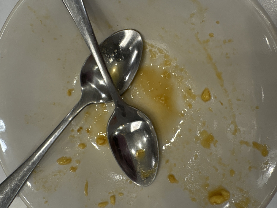 A top-down view shows a partially eaten bowl of food. Two silver spoons rest within the bowl, crossing each other near the center. Food residue, primarily yellow in color, is scattered across the white surface of the bowl. Some areas appear moist, suggesting the remnants of a liquid or sauce. The bowl's edge is visible, defining a circular space containing the spoons and food remnants.