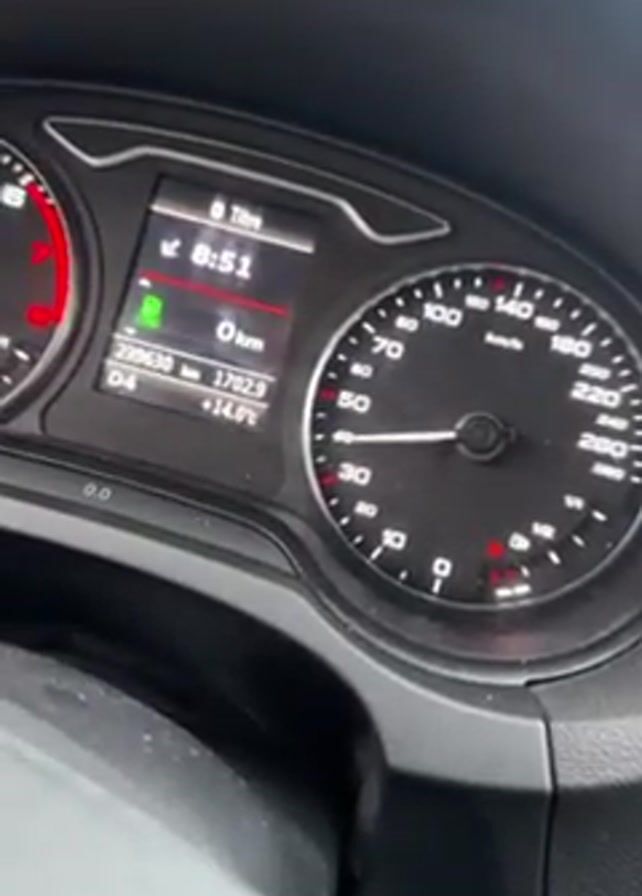 close-up of a car's dashboard while it is in operation. The speedometer shows a fluctuating speed, starting at zero, reaching around 50 km/h, and then dropping back towards zero. The car's information display indicates the time as 8:51, a distance of 0 km (likely indicating the trip meter), the total mileage as 239630 km, and an outside temperature of +14.0°C. The gear is briefly in D4 and then changes to D3. The dashboard itself is a black plastic material. The recording appears to be taken from inside the car while it is being driven.