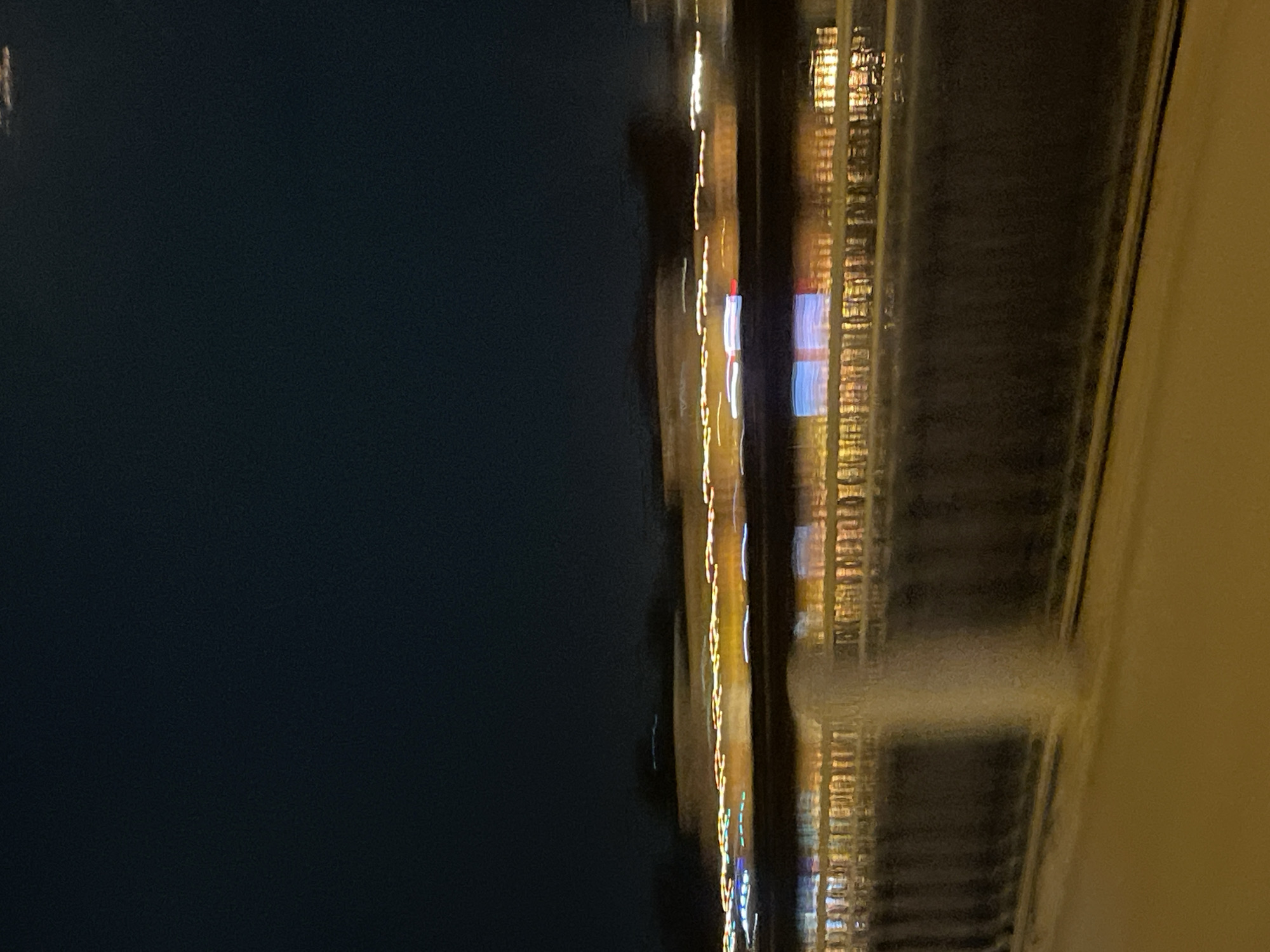 The image depicts a nighttime view from a high vantage point, likely a building in Saint Petersburg, Russia. On the right is a partial view of an interior wall and a window frame. Through the window, blurred city lights are visible, reflecting off a dark body of water on the left. The lights appear as vertical streaks of yellow, white, and blue.