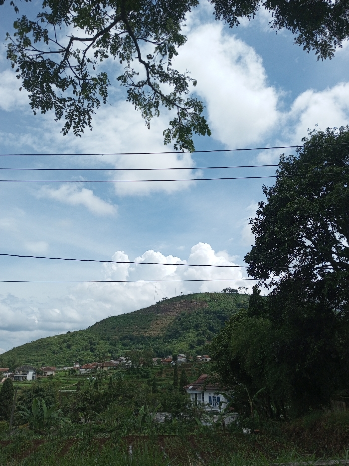A serene landscape features a lush green hill dotted with houses, set against a backdrop of a blue sky filled with fluffy white clouds. Overhead, tree branches with leaves frame the top of the image, while power lines stretch horizontally across the scene. The hill's peak reveals signs of possible deforestation or logging. The foreground is filled with dense greenery, partially obscuring a white house.