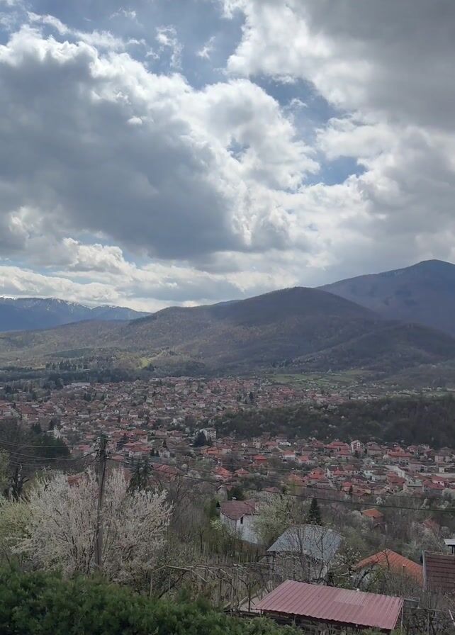 scenic view of a town nestled among hills and mountains. The town is characterized by numerous houses with red-tiled roofs. In the foreground, there is a tree with white blossoms and a green hedge. A winding road is visible on the left side of the frame. In the background, a range of mountains is capped with snow. The sky is overcast with dense, gray clouds interspersed with patches of blue. The camera pans slowly to the right, revealing more of the town and the mountainous landscape. The overall environment appears to be rural and tranquil. Utility poles and power lines stretch across the landscape.