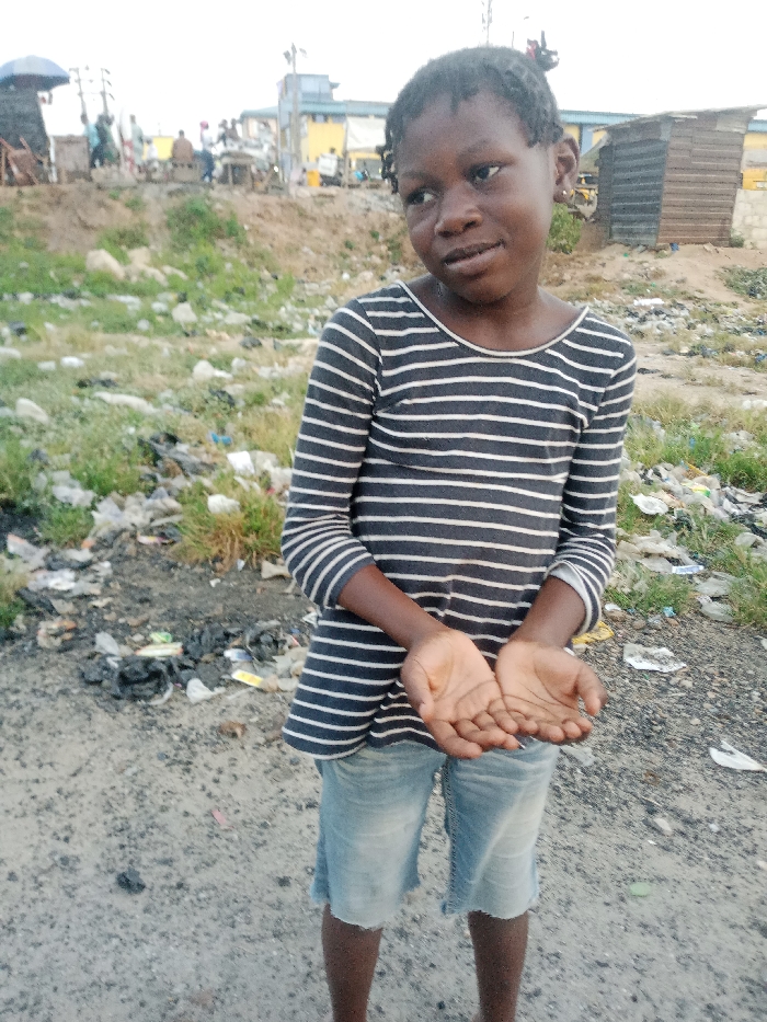 A young girl with braided hair stands on a dirt path, her palms open in a gesture of offering or supplication. She wears a striped shirt and denim shorts. The background is a scene of poverty, littered with trash and sparse vegetation. In the distance, some buildings are visible. The overall impression is one of hardship and perhaps a plea for help.