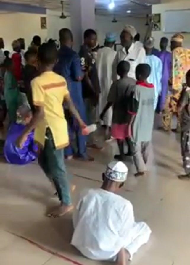 large room with people of various ages, including many children. Most of the people are standing or walking around, although some are seated on the floor. The room has a tiled floor and white walls with some decorations. Most people are wearing casual clothing. A few men are wearing traditional Muslim attire, including white robes and caps. The atmosphere seems lively and informal, possibly a gathering or celebration.