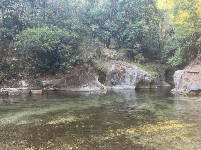The image displays a clear-water river or stream situated in Ponte de Lima, Portugal. The foreground and mid-ground are occupied by exceptionally clear water, revealing a riverbed composed of varied pebbles and stones, exhibiting shades of brown, grey, and green. Subtle ripples are evident on the water's surface, reflecting light. The left bank features a steep incline with exposed rock and dark soil, covered by dense green shrubs and trees. A dark, elongated wooden log or beam, approximately 1.5 meters in length, rests partially submerged at the water's edge on this bank. Behind the log, the bank transitions to an area of fallen leaves and small plants before ascending into thick foliage. The right bank consists of prominent, weathered rock formations. A large, dark grey boulder with patches of moss and reddish-brown discoloration borders the water on the immediate right. Further into the scene, another large rock formation with eroded features creates a shadowed indent in the bank. The background and upper frame are dominated by a dense canopy of green trees and shrubs, indicative of a natural forest environment. No human subjects, animals, or man-made structures (beyond the natural log) are present. The scene is illuminated by natural daylight, casting soft shadows within the vegetation and under the rock formations.