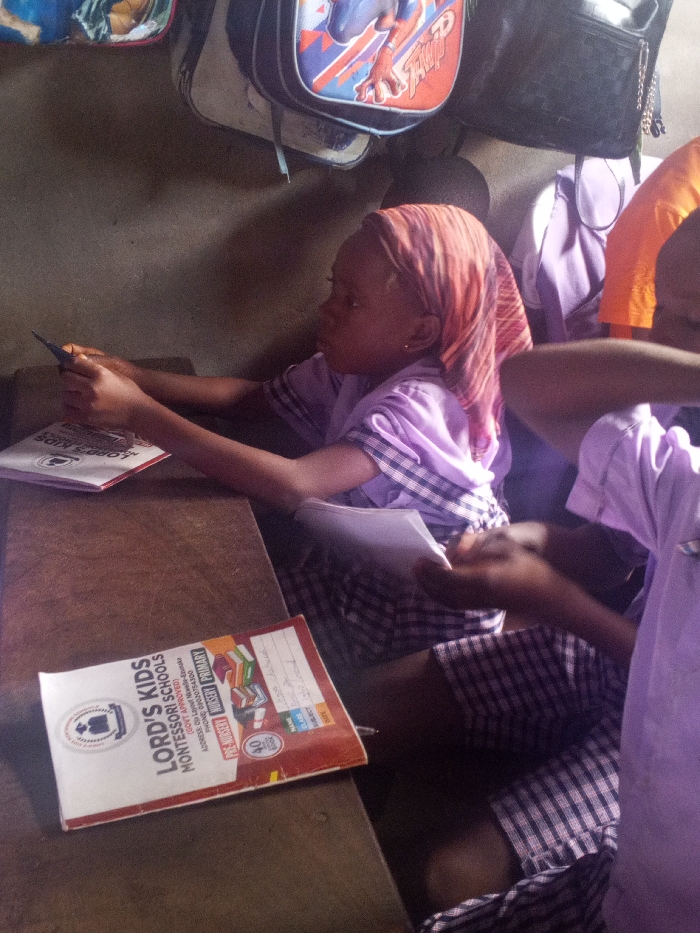 The image depicts a classroom scene in Ukwu-Abwa, Nigeria, specifically at Lord's Kids Montessori Schools