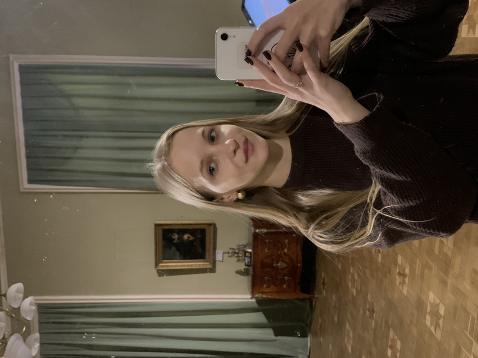 A young woman with long blonde hair, wearing a dark brown ribbed sweater and gold spherical earrings, is captured in a mirror selfie