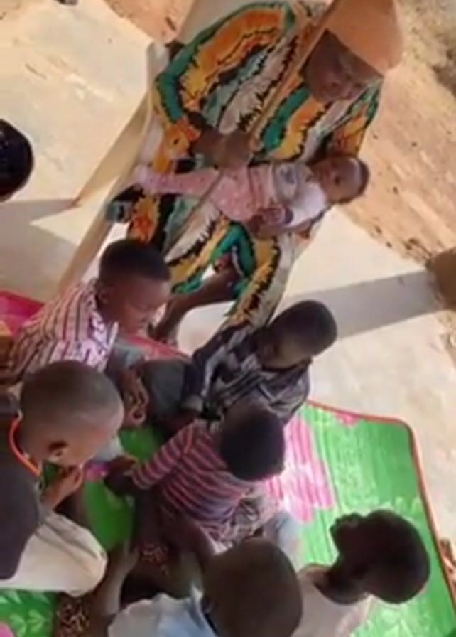 A woman is seated in a chair holding a baby in her arms while several young children sit around her on a mat, apparently listening. The woman in the chair is wearing a colorful patterned robe and a head covering. She holds a long, thin stick in her hand. The baby is wearing a pink outfit. The children are of various ages and are wearing different colored shirts. They are sitting on a colorful mat with a floral pattern. The scene appears to be outdoors, on a concrete surface. The background is blurred but shows some vegetation.