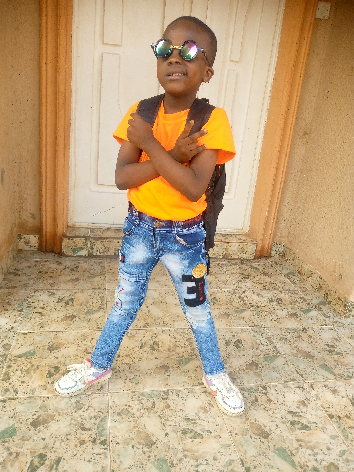 A full-body photograph displays a child standing on a tiled surface in Sabon Tasha, Nigeria. The child, with dark skin and short dark hair, is positioned centrally, wearing round, dark-framed sunglasses with iridescent lenses, a bright orange short-sleeved t-shirt, and a black backpack. Distressed blue denim jeans featuring multiple patches, including a black rectangular patch with a white 'E' and a yellow circular patch on the right thigh, cover the legs. White athletic shoes with light pink accents are on the feet. The child's arms are crossed at the chest, with the right hand forming a peace sign. The child's head is tilted slightly upwards and to the viewer's left, with a slight smile. Behind the child is a light-colored panel door within a frame. Adjacent to the door on both sides are sections of a light brown exterior wall. The ground consists of large, multi-colored tiles primarily in shades of beige, brown, and light green.