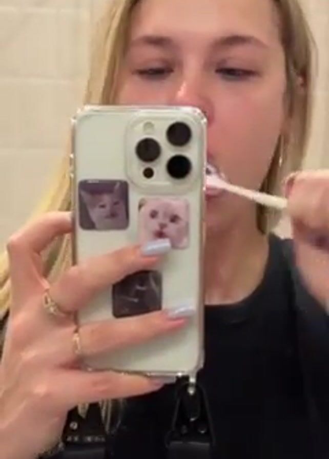 A woman with blonde hair is brushing her teeth in front of a bathroom mirror. She is holding up her phone to record herself. The phone case is transparent, and has three square pictures of cats stuck to it. The bathroom has white tiled walls.
