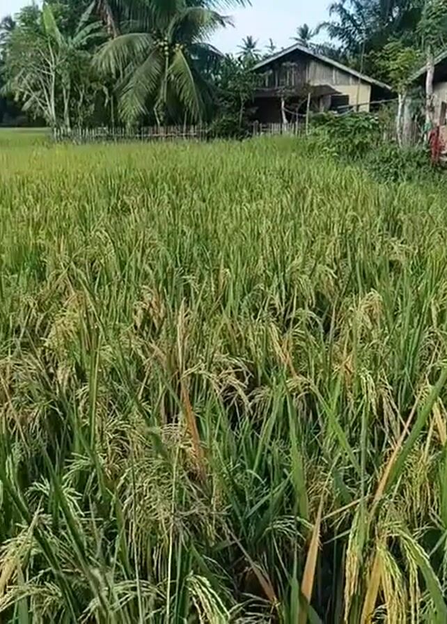 The video depicts a lush rice field. The rice stalks are tall, green, and laden with grains that are starting to turn golden, indicating ripeness. In the background, there are a couple of modest houses and trees, including some coconut palms. Clothes can be seen hanging on a line in the backyard of one of the houses. The sky is slightly overcast, providing even lighting across the scene. There are no people visible in the video. The camera appears stationary, providing a static view of the rice field and its surroundings.