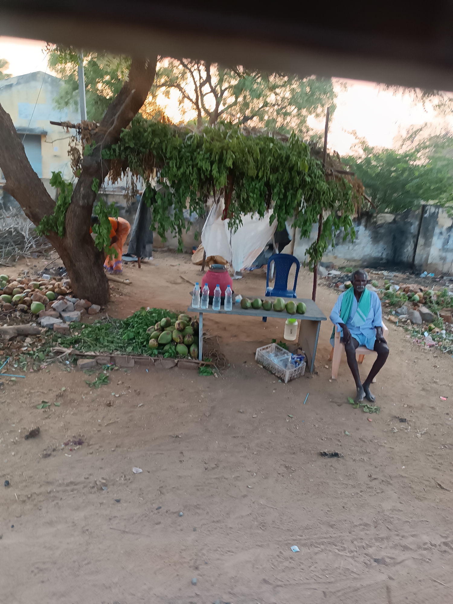 An outdoor scene in Kothacheruvu, India, depicts a makeshift vendor stall under a large tree with green foliage