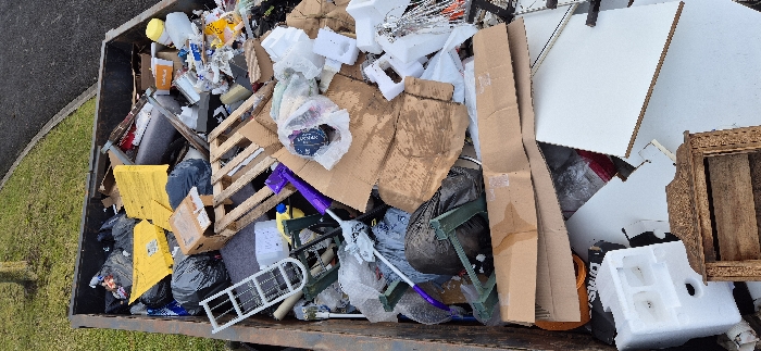 A dumpster overflows with assorted refuse, including cardboard boxes, white styrofoam, black trash bags, a wooden pallet, and other plastic debris