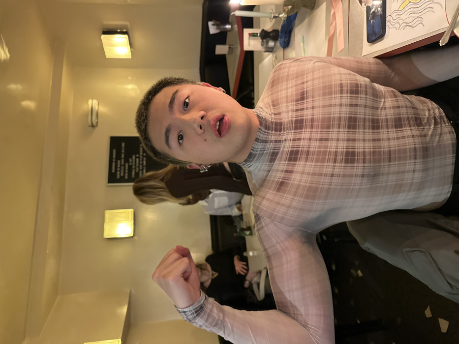 An individual with short, dyed blond hair, wearing a sheer, plaid long-sleeve shirt, poses indoors at a restaurant. They are holding up a fist. Several other people are seated at the table, and there is a menu on the wall behind them. Light fixtures are visible on the wall as well. The table contains dishes and other objects. The image is rotated.