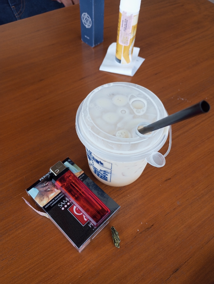 The image displays a close-up, high-angle view of items placed on a brown wooden table surface, situated in Cipanas, Indonesia. In the foreground, a clear plastic cup containing a light-colored liquid with visible spherical contents, likely ice or toppings, is present. A black plastic straw extends from the cup's transparent plastic dome lid. To the left of the cup, a partially opened pack of "SAMPOERNA A MILD" cigarettes, identifiable by its black packaging and red/white logo, rests on the table. A transparent red disposable lighter is positioned on top of the cigarette pack. A small, irregularly shaped, metallic-colored object lies on the table surface next to the cigarettes. In the mid-ground, a dark blue rectangular box stands upright, and a yellow cylindrical object with a white cap rests on a piece of crumpled white paper or receipt. A partial view of a person's leg, clad in blue denim jeans, is visible in the upper-left corner of the frame, indicating human occupation of the seating area.
