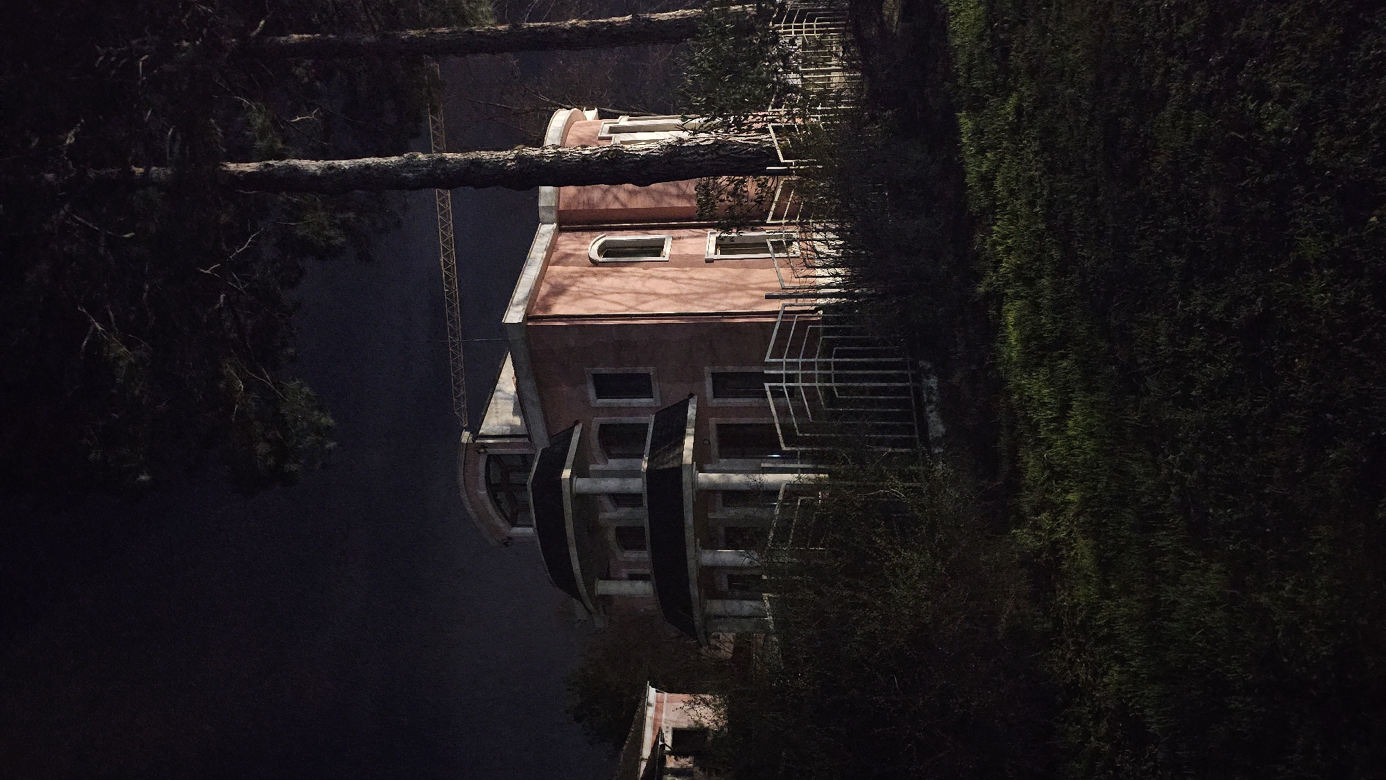 The image depicts a multi-story building at night in Hisarya, Bulgaria. The building has a unique architectural style with a curved section and balconies supported by pillars. The exterior is painted in shades of red and gray. Part of a tree is visible in the foreground, obscuring a crane structure in the background. The environment includes dark areas, possibly indicating nighttime or low-light conditions. The right side of the image is partially obscured by vegetation. Another structure is visible at the bottom of the frame.