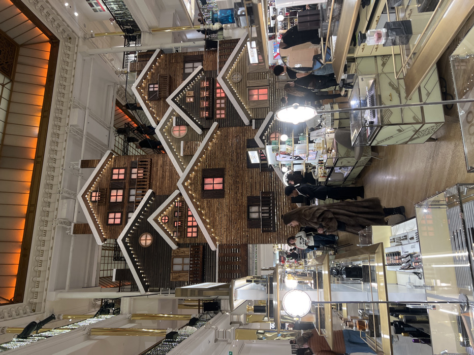 This image depicts the interior of Galeries Lafayette Haussmann, a large department store in Paris, France. The central feature is a massive, multi-tiered display of interconnected wooden chalet-style houses, resembling a winter village. These chalets are constructed from brown wood paneling, feature white gabled roofs outlined with small string lights, and contain windows emitting a warm, reddish-orange light. Some chalets include small balconies. In the foreground and midground, a retail floor is active with numerous illuminated display counters and glass cases. These units are gold-toned and feature geometric patterns on their bases, showcasing an array of cosmetic and perfume products. Circular, bright white lights are integrated into these displays. Multiple individuals are present throughout the store. In the midground, a woman in a brown fur coat stands facing the displays. Other shoppers and store personnel are visible browsing merchandise, walking between displays, and observing the scene. Figures are also discernible on the upper levels of the department store, along balconies with dark ornate railings and gilded columns, some moving on escalators integrated into the chalet display. The overall environment is well-lit, indicative of a commercial setting, likely during a festive period.