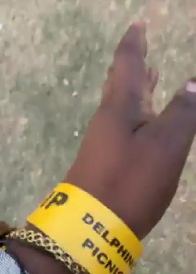 A person's hand is featured in the video, showing a large ring with a yellow stone, a yellow VIP wristband, and a gold chain bracelet