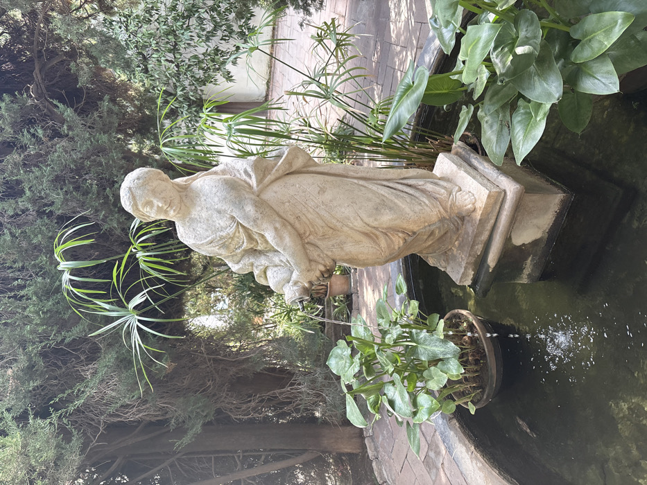 - "This image depicts a weathered stone statue of a woman standing in a circular stone fountain basin, centrally located within a lush garden setting" by FM-Y5o3W2, licensed under CC BY 4.0