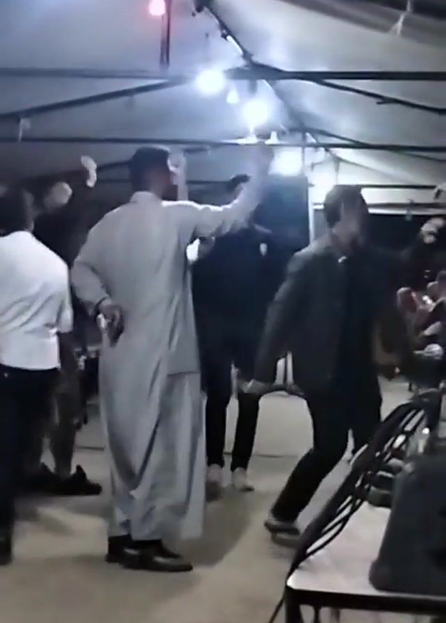 group of men dancing to music in a tent-like space, presumably at a celebration or event