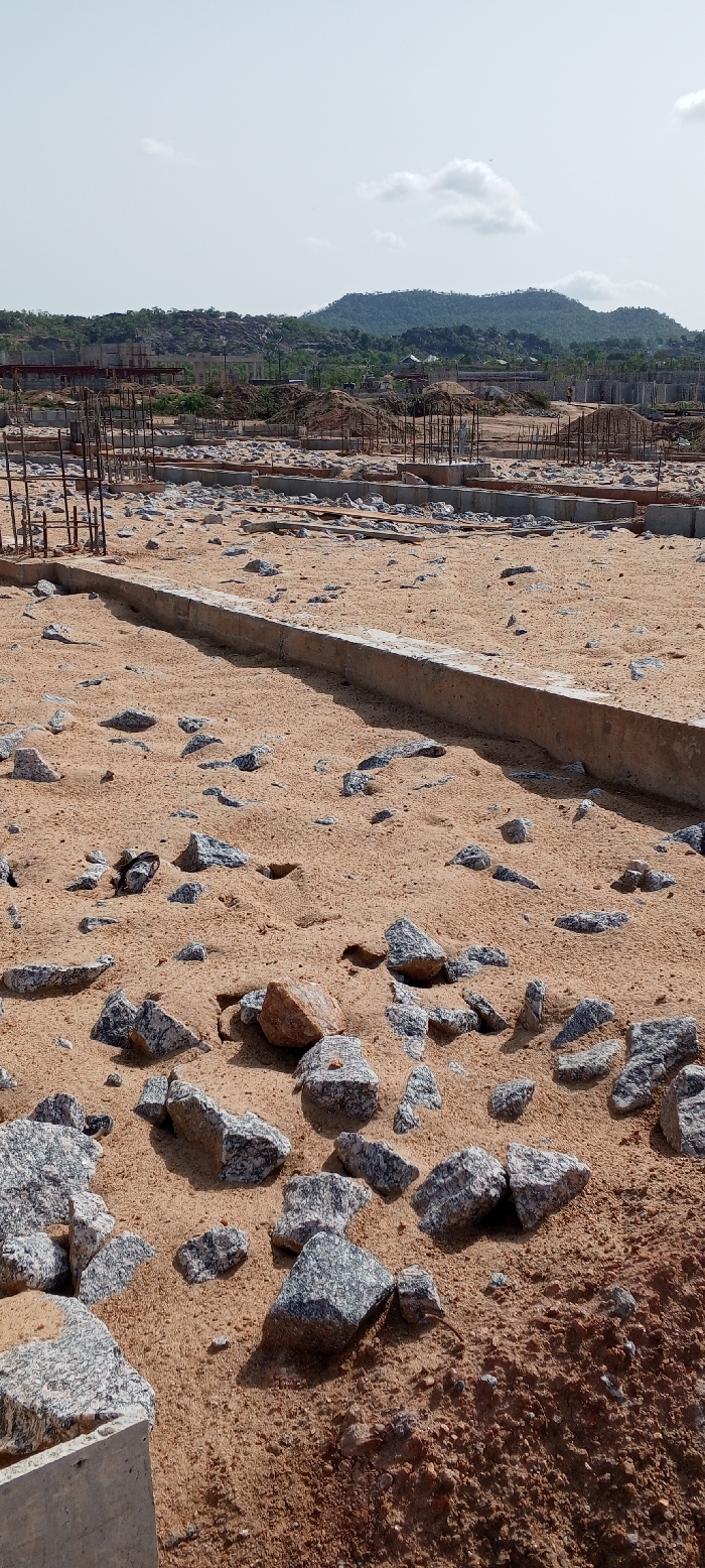 construction site in Unknown, Unknown. The ground is covered in sand and rocks, with concrete foundations and rebar structures visible. In the background, there is a hill with some trees. The sky is clear with a few clouds. There are no people in the immediate foreground.
