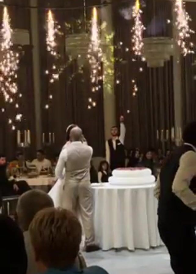 wedding reception. A bride in a white dress and a groom in a light-colored suit are standing behind a table with a white wedding cake. As they appear to cut the cake, indoor fireworks go off from fixtures in the ceiling. Several guests are visible, seated at tables or standing around the dance floor. The reception hall has tall windows and ornate chandeliers.