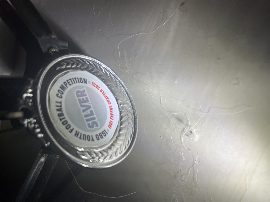 A downward-angled, close-up photograph displays a silver-colored medal. The circular medal has a decorative edge and is inscribed with "1680 YOUTH FOOTBALL COMPETITION" arced across the top, "SILVER" centered prominently, and "IKOT EKPENE CHAPTER 2025" arced across the bottom. The medal is connected to a dark, angular, multi-part structure, possibly a stand or suspension mechanism, visible at the top of the frame. It rests upon a reflective, light-grey surface, which exhibits numerous thin, white, filamentous fibers and small specks of dust. A distinct, bright light source illuminates the lower-central area of the surface, highlighting the debris. The inscription on the medal confirms its association with Ikot Ekpene, Nigeria. No people, actions, or interactions are visible.