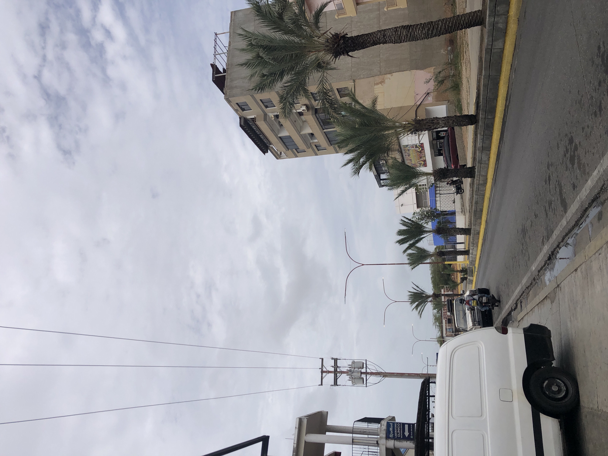 The scene depicts a street in Juan Griego, Venezuela, under a cloudy sky. A building stands to the left, several palm trees are planted along the street, and a white van is parked on the right side of the road. Additionally, a person is riding a motorcycle in the road. The electrical infrastructure is also visible, including poles and wires.